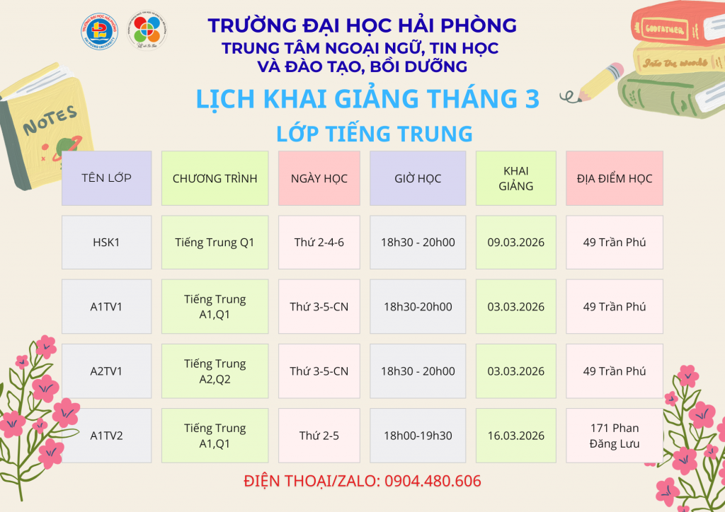 • Lớp HSK1 (Quyển 1): Khai giảng 09/03 | Học Thứ 2-4-6 (18h30 – 20h00) tại 49 Trần Phú.
